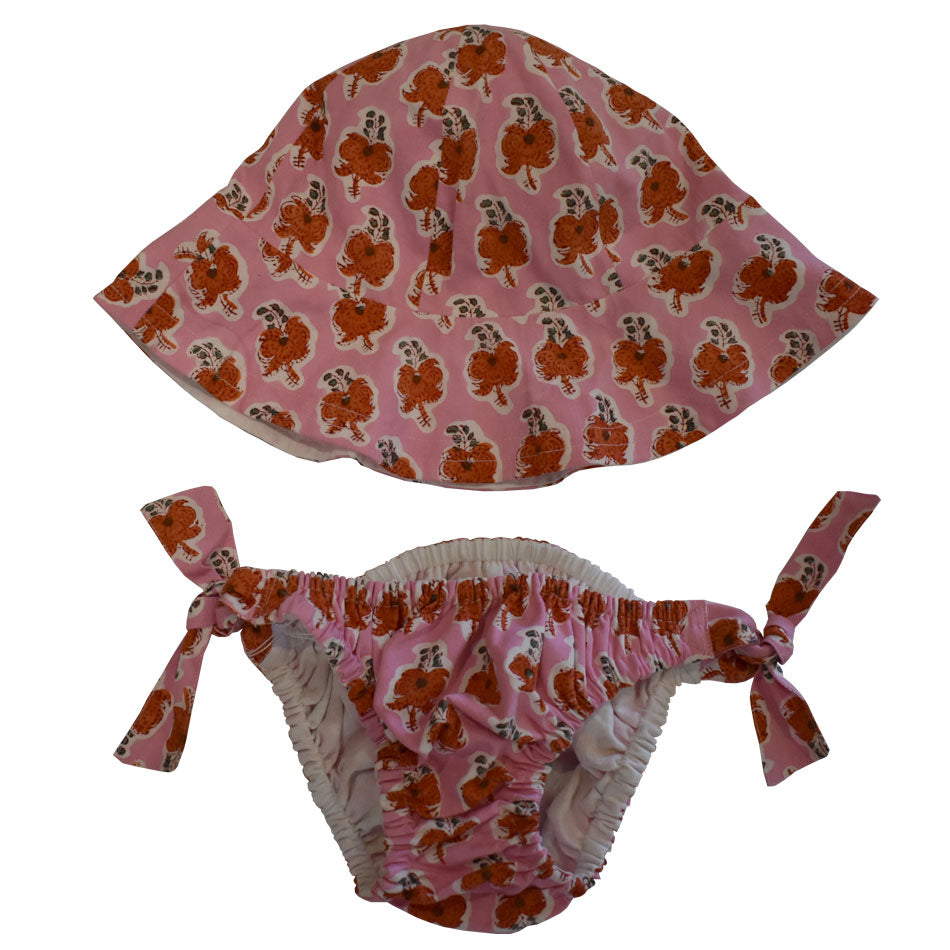 The baby bikinis are sold with a adjustable bottoms to change the sizing along with a sun safety bucket hat. Available in Gypsy and Spice fabric, which is 100% cotton.